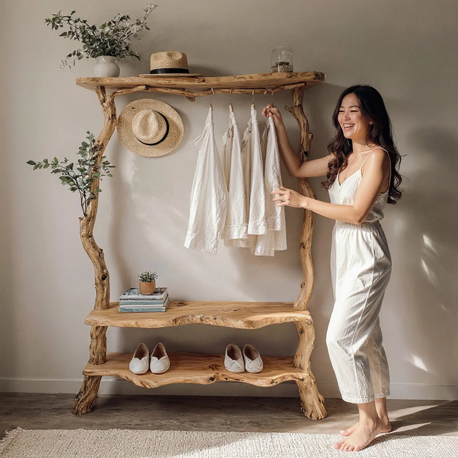 Place it near the door for coats, umbrellas, and bags, or use it in a bedroom for daily outfits and accessories. The shelves are suitable for lightweight items such as small books, framed photos, or a catchall dish. This setup can help reduce clutter by giving everything a clear home.