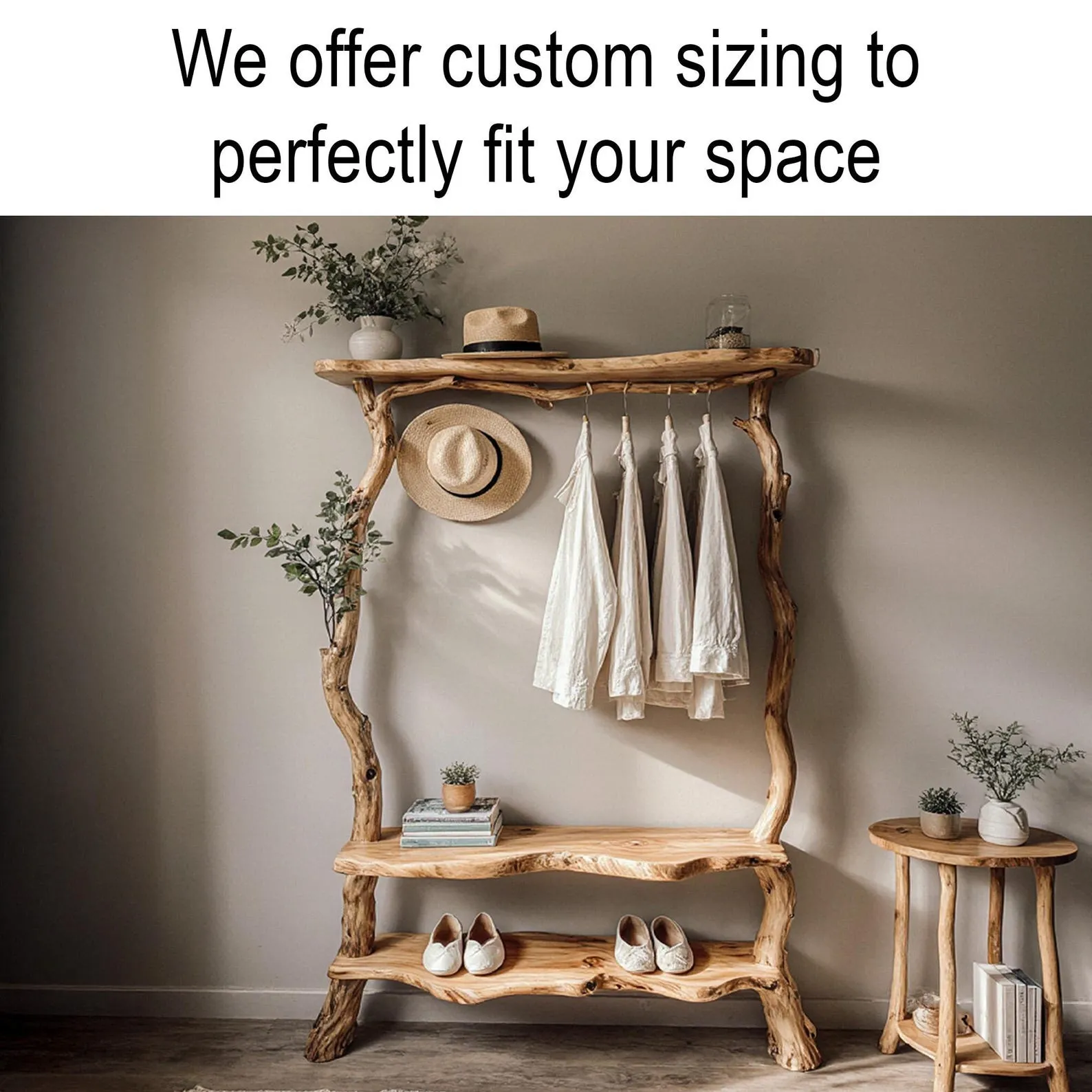 This standing coat rack uses a tree branch silhouette with driftwood styling to bring storage and wall decor together. The design includes decorative hooks for hanging clothing and a set of wall shelves for display, creating a coordinated entryway look.